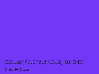 CIELab 43.046,67.012,-85.342 Color is a normal indigo color and the nearest color is Blue Violet #8a2be2. Hex code #7338f7 and RGB value is rgb(115,56,247). In RGB color space, this color is composed of 45% red, 22% green, 97% blue, In CMYK color space, this color is composed of 53% cyan, 77% magenta, 0% yellow , 3% black , In HSL color space, this color has a hue angle of 259° , 92% saturation and 59% lightness.