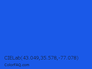 CIELab 43.049,35.578,-77.078 Color is a normal blue color and the nearest color is Palatinate Blue #273be2. Hex code #1a59e8 and RGB value is rgb(26,89,232). In RGB color space, this color is composed of 10% red, 35% green, 91% blue, In CMYK color space, this color is composed of 89% cyan, 62% magenta, 0% yellow , 9% black , In HSL color space, this color has a hue angle of 222° , 82% saturation and 51% lightness.