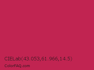 CIELab 43.053,61.966,14.5 Color is a normal rose color and the nearest color is Rose Red #c21e56. Hex code #c12451 and RGB value is rgb(193,36,81). In RGB color space, this color is composed of 76% red, 14% green, 32% blue, In CMYK color space, this color is composed of 0% cyan, 81% magenta, 58% yellow , 24% black , In HSL color space, this color has a hue angle of 343° , 69% saturation and 45% lightness.