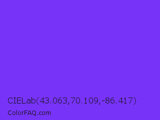CIELab 43.063,70.109,-86.417 Color is a normal violet color and the nearest color is Blue Violet #8a2be2. Hex code #7833f9 and RGB value is rgb(120,51,249). In RGB color space, this color is composed of 47% red, 20% green, 98% blue, In CMYK color space, this color is composed of 52% cyan, 80% magenta, 0% yellow , 2% black , In HSL color space, this color has a hue angle of 261° , 94% saturation and 59% lightness.