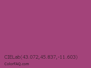 CIELab 43.072,45.837,-11.603 Color is a normal magenta color and the nearest color is Magenta Haze #9f4576. Hex code #a3437a and RGB value is rgb(163,67,122). In RGB color space, this color is composed of 64% red, 26% green, 48% blue, In CMYK color space, this color is composed of 0% cyan, 59% magenta, 25% yellow , 36% black , In HSL color space, this color has a hue angle of 326° , 42% saturation and 45% lightness.