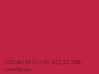 CIELab 43.077,61.912,23.338 Color is a normal red color and the nearest color is Maroon Flush #c32148. Hex code #c32343 and RGB value is rgb(195,35,67). In RGB color space, this color is composed of 76% red, 14% green, 26% blue, In CMYK color space, this color is composed of 0% cyan, 82% magenta, 66% yellow , 24% black , In HSL color space, this color has a hue angle of 348° , 70% saturation and 45% lightness.