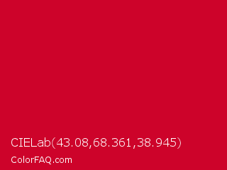 CIELab 43.08,68.361,38.945 Color is a normal red color and the nearest color is Vivid Crimson #cc0033. Hex code #cd032a and RGB value is rgb(205,3,42). In RGB color space, this color is composed of 80% red, 1% green, 16% blue, In CMYK color space, this color is composed of 0% cyan, 99% magenta, 80% yellow , 20% black , In HSL color space, this color has a hue angle of 348° , 97% saturation and 41% lightness.