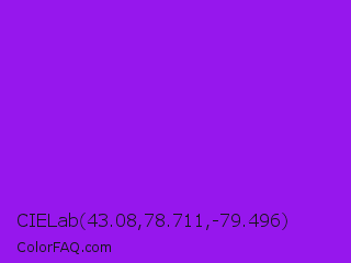 CIELab 43.08,78.711,-79.496 Color is a normal purple color and the nearest color is Veronica #a020f0. Hex code #9617ed and RGB value is rgb(150,23,237). In RGB color space, this color is composed of 59% red, 9% green, 93% blue, In CMYK color space, this color is composed of 37% cyan, 90% magenta, 0% yellow , 7% black , In HSL color space, this color has a hue angle of 276° , 86% saturation and 51% lightness.