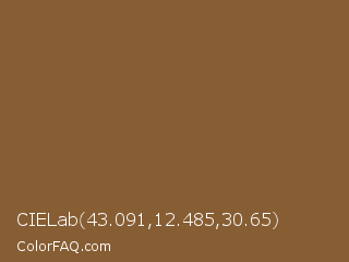 CIELab 43.091,12.485,30.65 Color is a normal orange color and the nearest color is Potters Clay #8c5738. Hex code #875d33 and RGB value is rgb(135,93,51). In RGB color space, this color is composed of 53% red, 36% green, 20% blue, In CMYK color space, this color is composed of 0% cyan, 31% magenta, 62% yellow , 47% black , In HSL color space, this color has a hue angle of 30° , 45% saturation and 36% lightness.