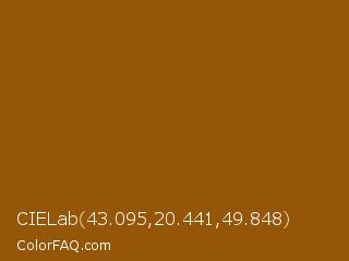 CIELab 43.095,20.441,49.848 Color is a normal orange color and the nearest color is Chelsea Gem #9e5302. Hex code #955707 and RGB value is rgb(149,87,7). In RGB color space, this color is composed of 58% red, 34% green, 3% blue, In CMYK color space, this color is composed of 0% cyan, 42% magenta, 95% yellow , 42% black , In HSL color space, this color has a hue angle of 34° , 91% saturation and 31% lightness.