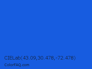 CIELab 43.09,30.478,-72.478 Color is a normal blue color and the nearest color is Bright Navy Blue #1974d2. Hex code #175ce0 and RGB value is rgb(23,92,224). In RGB color space, this color is composed of 9% red, 36% green, 88% blue, In CMYK color space, this color is composed of 90% cyan, 59% magenta, 0% yellow , 12% black , In HSL color space, this color has a hue angle of 219° , 81% saturation and 48% lightness.