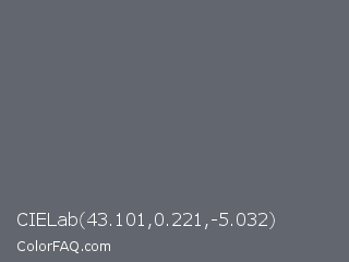 CIELab 43.101,0.221,-5.032 Color is a normal blue color and the nearest color is Shuttle Gray #5f6672. Hex code #62666e and RGB value is rgb(98,102,110). In RGB color space, this color is composed of 38% red, 40% green, 43% blue, In CMYK color space, this color is composed of 11% cyan, 7% magenta, 0% yellow , 57% black , In HSL color space, this color has a hue angle of 220° , 6% saturation and 41% lightness.