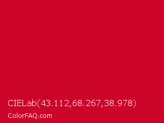 CIELab 43.112,68.267,38.978 Color is a normal red color and the nearest color is Vivid Crimson #cc0033. Hex code #cd042a and RGB value is rgb(205,4,42). In RGB color space, this color is composed of 80% red, 2% green, 16% blue, In CMYK color space, this color is composed of 0% cyan, 98% magenta, 80% yellow , 20% black , In HSL color space, this color has a hue angle of 349° , 96% saturation and 41% lightness.