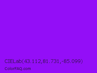CIELab 43.112,81.731,-85.099 Color is a normal purple color and the nearest color is Electric Violet #8f00ff. Hex code #930ef7 and RGB value is rgb(147,14,247). In RGB color space, this color is composed of 58% red, 5% green, 97% blue, In CMYK color space, this color is composed of 40% cyan, 94% magenta, 0% yellow , 3% black , In HSL color space, this color has a hue angle of 274° , 94% saturation and 51% lightness.