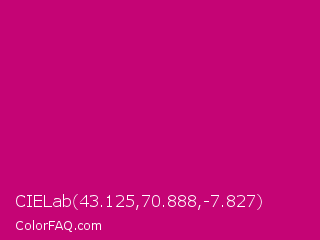 CIELab 43.125,70.888,-7.827 Color is a normal magenta color and the nearest color is Red Violet #c71585. Hex code #c50475 and RGB value is rgb(197,4,117). In RGB color space, this color is composed of 77% red, 2% green, 46% blue, In CMYK color space, this color is composed of 0% cyan, 98% magenta, 41% yellow , 23% black , In HSL color space, this color has a hue angle of 325° , 96% saturation and 39% lightness.