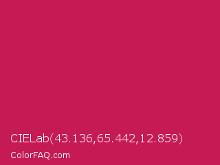 CIELab 43.136,65.442,12.859 Color is a normal rose color and the nearest color is Rose Red #c21e56. Hex code #c51a54 and RGB value is rgb(197,26,84). In RGB color space, this color is composed of 77% red, 10% green, 33% blue, In CMYK color space, this color is composed of 0% cyan, 87% magenta, 57% yellow , 23% black , In HSL color space, this color has a hue angle of 340° , 77% saturation and 44% lightness.