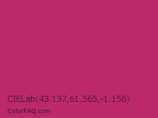 CIELab 43.137,61.565,-1.156 Color is a normal rose color and the nearest color is Hibiscus #b6316c. Hex code #bc286a and RGB value is rgb(188,40,106). In RGB color space, this color is composed of 74% red, 16% green, 42% blue, In CMYK color space, this color is composed of 0% cyan, 79% magenta, 44% yellow , 26% black , In HSL color space, this color has a hue angle of 333° , 65% saturation and 45% lightness.