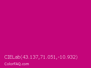 CIELab 43.137,71.051,-10.932 Color is a normal magenta color and the nearest color is Red Violet #c71585. Hex code #c4057a and RGB value is rgb(196,5,122). In RGB color space, this color is composed of 77% red, 2% green, 48% blue, In CMYK color space, this color is composed of 0% cyan, 97% magenta, 38% yellow , 23% black , In HSL color space, this color has a hue angle of 323° , 95% saturation and 39% lightness.