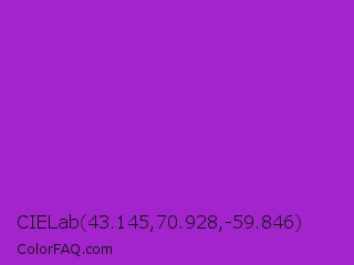 CIELab 43.145,70.928,-59.846 Color is a normal purple color and the nearest color is Dark Orchid #9932cc. Hex code #a224cb and RGB value is rgb(162,36,203). In RGB color space, this color is composed of 64% red, 14% green, 80% blue, In CMYK color space, this color is composed of 20% cyan, 82% magenta, 0% yellow , 20% black , In HSL color space, this color has a hue angle of 285° , 70% saturation and 47% lightness.