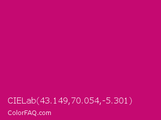 CIELab 43.149,70.054,-5.301 Color is a normal magenta color and the nearest color is Red Violet #c71585. Hex code #c50971 and RGB value is rgb(197,9,113). In RGB color space, this color is composed of 77% red, 4% green, 44% blue, In CMYK color space, this color is composed of 0% cyan, 95% magenta, 43% yellow , 23% black , In HSL color space, this color has a hue angle of 327° , 91% saturation and 40% lightness.