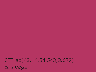 CIELab 43.14,54.543,3.672 Color is a normal rose color and the nearest color is Rich Maroon #b03060. Hex code #b53562 and RGB value is rgb(181,53,98). In RGB color space, this color is composed of 71% red, 21% green, 38% blue, In CMYK color space, this color is composed of 0% cyan, 71% magenta, 46% yellow , 29% black , In HSL color space, this color has a hue angle of 339° , 55% saturation and 46% lightness.