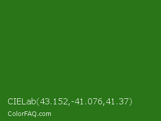 CIELab 43.152,-41.076,41.37 Color is a dark green color and the nearest color is Bilbao #327c14. Hex code #297518 and RGB value is rgb(41,117,24). In RGB color space, this color is composed of 16% red, 46% green, 9% blue, In CMYK color space, this color is composed of 65% cyan, 0% magenta, 79% yellow , 54% black , In HSL color space, this color has a hue angle of 109° , 66% saturation and 28% lightness.