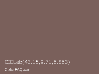 CIELab 43.15,9.71,6.863 Color is a normal red color and the nearest color is Deep Taupe #7e5e60. Hex code #7a605b and RGB value is rgb(122,96,91). In RGB color space, this color is composed of 48% red, 38% green, 36% blue, In CMYK color space, this color is composed of 0% cyan, 21% magenta, 25% yellow , 52% black , In HSL color space, this color has a hue angle of 10° , 15% saturation and 42% lightness.
