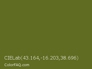 CIELab 43.164,-16.203,38.696 Color is a dark yellow color and the nearest color is Fern Frond #657220. Hex code #5f6c21 and RGB value is rgb(95,108,33). In RGB color space, this color is composed of 37% red, 42% green, 13% blue, In CMYK color space, this color is composed of 12% cyan, 0% magenta, 69% yellow , 58% black , In HSL color space, this color has a hue angle of 70° , 53% saturation and 28% lightness.