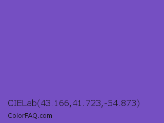 CIELab 43.166,41.723,-54.873 Color is a normal indigo color and the nearest color is Fuchsia Blue #7a58c1. Hex code #754fc2 and RGB value is rgb(117,79,194). In RGB color space, this color is composed of 46% red, 31% green, 76% blue, In CMYK color space, this color is composed of 40% cyan, 59% magenta, 0% yellow , 24% black , In HSL color space, this color has a hue angle of 260° , 49% saturation and 54% lightness.