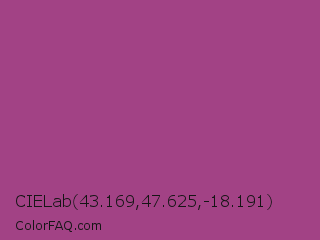 CIELab 43.169,47.625,-18.191 Color is a normal magenta color and the nearest color is Maximum Red Purple #a63a79. Hex code #a24285 and RGB value is rgb(162,66,133). In RGB color space, this color is composed of 64% red, 26% green, 52% blue, In CMYK color space, this color is composed of 0% cyan, 59% magenta, 18% yellow , 36% black , In HSL color space, this color has a hue angle of 318° , 42% saturation and 45% lightness.