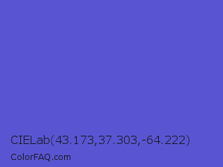 CIELab 43.173,37.303,-64.222 Color is a normal indigo color and the nearest color is Iris #5a4fcf. Hex code #5955d2 and RGB value is rgb(89,85,210). In RGB color space, this color is composed of 35% red, 33% green, 82% blue, In CMYK color space, this color is composed of 58% cyan, 60% magenta, 0% yellow , 18% black , In HSL color space, this color has a hue angle of 242° , 58% saturation and 58% lightness.