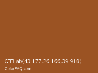 CIELab 43.177,26.166,39.918 Color is a normal orange color and the nearest color is Paarl #a65529. Hex code #9b5323 and RGB value is rgb(155,83,35). In RGB color space, this color is composed of 61% red, 33% green, 14% blue, In CMYK color space, this color is composed of 0% cyan, 46% magenta, 77% yellow , 39% black , In HSL color space, this color has a hue angle of 24° , 63% saturation and 37% lightness.