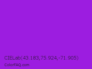 CIELab 43.183,75.924,-71.905 Color is a normal purple color and the nearest color is Veronica #a020f0. Hex code #9c1ce0 and RGB value is rgb(156,28,224). In RGB color space, this color is composed of 61% red, 11% green, 88% blue, In CMYK color space, this color is composed of 30% cyan, 88% magenta, 0% yellow , 12% black , In HSL color space, this color has a hue angle of 279° , 78% saturation and 49% lightness.