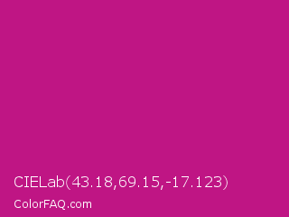 CIELab 43.18,69.15,-17.123 Color is a normal magenta color and the nearest color is Red Violet #c71585. Hex code #bf1584 and RGB value is rgb(191,21,132). In RGB color space, this color is composed of 75% red, 8% green, 52% blue, In CMYK color space, this color is composed of 0% cyan, 89% magenta, 31% yellow , 25% black , In HSL color space, this color has a hue angle of 321° , 80% saturation and 42% lightness.