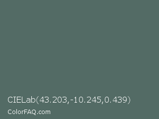 CIELab 43.203,-10.245,0.439 Color is a normal cyan color and the nearest color is Stormcloud #4f666a. Hex code #536b65 and RGB value is rgb(83,107,101). In RGB color space, this color is composed of 33% red, 42% green, 40% blue, In CMYK color space, this color is composed of 22% cyan, 0% magenta, 6% yellow , 58% black , In HSL color space, this color has a hue angle of 165° , 13% saturation and 37% lightness.