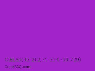 CIELab 43.212,71.354,-59.729 Color is a normal purple color and the nearest color is Dark Orchid #9932cc. Hex code #a323cb and RGB value is rgb(163,35,203). In RGB color space, this color is composed of 64% red, 14% green, 80% blue, In CMYK color space, this color is composed of 20% cyan, 83% magenta, 0% yellow , 20% black , In HSL color space, this color has a hue angle of 286° , 71% saturation and 47% lightness.