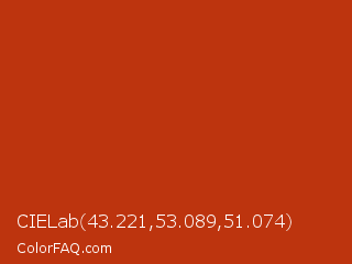 CIELab 43.221,53.089,51.074 Color is a normal red color and the nearest color is Thunderbird #c02b18. Hex code #bd340e and RGB value is rgb(189,52,14). In RGB color space, this color is composed of 74% red, 20% green, 5% blue, In CMYK color space, this color is composed of 0% cyan, 72% magenta, 93% yellow , 26% black , In HSL color space, this color has a hue angle of 13° , 86% saturation and 40% lightness.