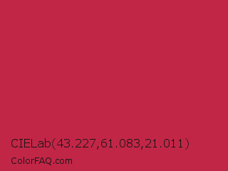 CIELab 43.227,61.083,21.011 Color is a normal red color and the nearest color is Maroon Flush #c32148. Hex code #c22647 and RGB value is rgb(194,38,71). In RGB color space, this color is composed of 76% red, 15% green, 28% blue, In CMYK color space, this color is composed of 0% cyan, 80% magenta, 63% yellow , 24% black , In HSL color space, this color has a hue angle of 347° , 67% saturation and 45% lightness.