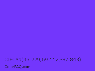 CIELab 43.229,69.112,-87.843 Color is a normal indigo color and the nearest color is Blue Violet #8a2be2. Hex code #7336fc and RGB value is rgb(115,54,252). In RGB color space, this color is composed of 45% red, 21% green, 99% blue, In CMYK color space, this color is composed of 54% cyan, 79% magenta, 0% yellow , 1% black , In HSL color space, this color has a hue angle of 258° , 97% saturation and 60% lightness.