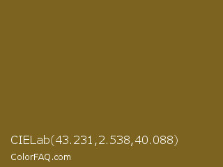 CIELab 43.231,2.538,40.088 Color is a normal orange color and the nearest color is Kumera #886221. Hex code #7c6320 and RGB value is rgb(124,99,32). In RGB color space, this color is composed of 49% red, 39% green, 13% blue, In CMYK color space, this color is composed of 0% cyan, 20% magenta, 74% yellow , 51% black , In HSL color space, this color has a hue angle of 44° , 59% saturation and 31% lightness.