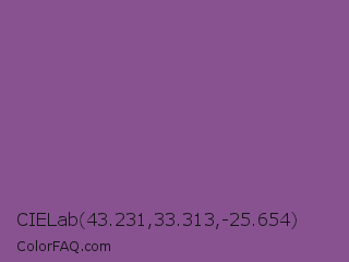 CIELab 43.231,33.313,-25.654 Color is a normal purple color and the nearest color is Razzmic Berry #8d4e85. Hex code #885291 and RGB value is rgb(136,82,145). In RGB color space, this color is composed of 53% red, 32% green, 57% blue, In CMYK color space, this color is composed of 6% cyan, 43% magenta, 0% yellow , 43% black , In HSL color space, this color has a hue angle of 291° , 28% saturation and 45% lightness.