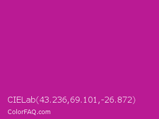 CIELab 43.236,69.101,-26.872 Color is a normal magenta color and the nearest color is Red Violet #c71585. Hex code #ba1a94 and RGB value is rgb(186,26,148). In RGB color space, this color is composed of 73% red, 10% green, 58% blue, In CMYK color space, this color is composed of 0% cyan, 86% magenta, 20% yellow , 27% black , In HSL color space, this color has a hue angle of 314° , 75% saturation and 42% lightness.