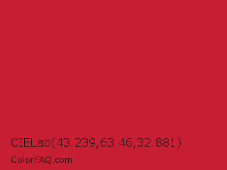 CIELab 43.239,63.46,32.881 Color is a normal red color and the nearest color is Cardinal #c41e3a. Hex code #c71e34 and RGB value is rgb(199,30,52). In RGB color space, this color is composed of 78% red, 12% green, 20% blue, In CMYK color space, this color is composed of 0% cyan, 85% magenta, 74% yellow , 22% black , In HSL color space, this color has a hue angle of 352° , 74% saturation and 45% lightness.