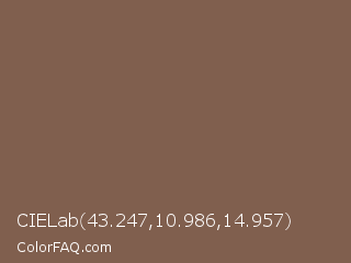 CIELab 43.247,10.986,14.957 Color is a normal orange color and the nearest color is Roman Coffee #795d4c. Hex code #805f4e and RGB value is rgb(128,95,78). In RGB color space, this color is composed of 50% red, 37% green, 31% blue, In CMYK color space, this color is composed of 0% cyan, 26% magenta, 39% yellow , 50% black , In HSL color space, this color has a hue angle of 20° , 24% saturation and 40% lightness.