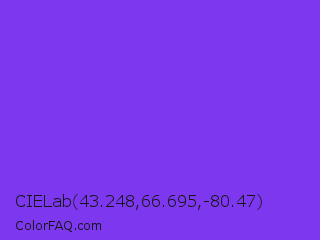 CIELab 43.248,66.695,-80.47 Color is a normal violet color and the nearest color is Blue Violet #8a2be2. Hex code #7d37ef and RGB value is rgb(125,55,239). In RGB color space, this color is composed of 49% red, 22% green, 94% blue, In CMYK color space, this color is composed of 48% cyan, 77% magenta, 0% yellow , 6% black , In HSL color space, this color has a hue angle of 263° , 85% saturation and 58% lightness.