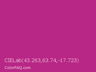 CIELab 43.263,63.74,-17.723 Color is a normal magenta color and the nearest color is Medium Red Violet #bb3385. Hex code #b82785 and RGB value is rgb(184,39,133). In RGB color space, this color is composed of 72% red, 15% green, 52% blue, In CMYK color space, this color is composed of 0% cyan, 79% magenta, 28% yellow , 28% black , In HSL color space, this color has a hue angle of 321° , 65% saturation and 44% lightness.