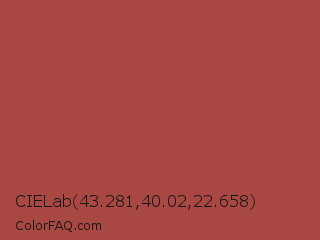 CIELab 43.281,40.02,22.658 Color is a normal red color and the nearest color is Apple Blossom #af4d43. Hex code #a94743 and RGB value is rgb(169,71,67). In RGB color space, this color is composed of 66% red, 28% green, 26% blue, In CMYK color space, this color is composed of 0% cyan, 58% magenta, 60% yellow , 34% black , In HSL color space, this color has a hue angle of 2° , 43% saturation and 46% lightness.
