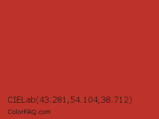 CIELab 43.281,54.104,38.712 Color is a normal red color and the nearest color is International Orange Golden Gate Bridge #c0362c. Hex code #bd3329 and RGB value is rgb(189,51,41). In RGB color space, this color is composed of 74% red, 20% green, 16% blue, In CMYK color space, this color is composed of 0% cyan, 73% magenta, 78% yellow , 26% black , In HSL color space, this color has a hue angle of 4° , 64% saturation and 45% lightness.