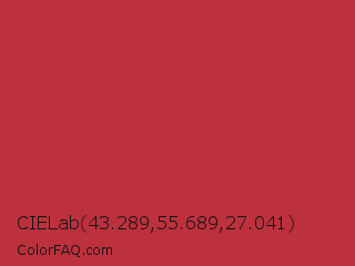 CIELab 43.289,55.689,27.041 Color is a normal red color and the nearest color is Brick Red #c62d42. Hex code #bd313d and RGB value is rgb(189,49,61). In RGB color space, this color is composed of 74% red, 19% green, 24% blue, In CMYK color space, this color is composed of 0% cyan, 74% magenta, 68% yellow , 26% black , In HSL color space, this color has a hue angle of 355° , 59% saturation and 47% lightness.