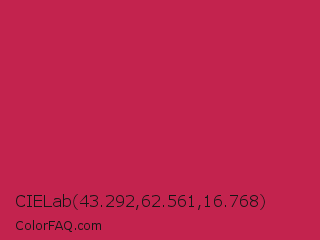 CIELab 43.292,62.561,16.768 Color is a normal rose color and the nearest color is Maroon Flush #c32148. Hex code #c3234e and RGB value is rgb(195,35,78). In RGB color space, this color is composed of 76% red, 14% green, 31% blue, In CMYK color space, this color is composed of 0% cyan, 82% magenta, 60% yellow , 24% black , In HSL color space, this color has a hue angle of 344° , 70% saturation and 45% lightness.
