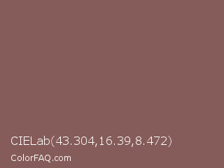 CIELab 43.304,16.39,8.472 Color is a normal red color and the nearest color is Deep Taupe #7e5e60. Hex code #855c59 and RGB value is rgb(133,92,89). In RGB color space, this color is composed of 52% red, 36% green, 35% blue, In CMYK color space, this color is composed of 0% cyan, 31% magenta, 33% yellow , 48% black , In HSL color space, this color has a hue angle of 4° , 20% saturation and 44% lightness.