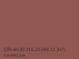CIELab 43.316,23.089,12.347 Color is a normal red color and the nearest color is Spicy Mix #8b5f4d. Hex code #905753 and RGB value is rgb(144,87,83). In RGB color space, this color is composed of 56% red, 34% green, 33% blue, In CMYK color space, this color is composed of 0% cyan, 40% magenta, 42% yellow , 44% black , In HSL color space, this color has a hue angle of 4° , 27% saturation and 45% lightness.