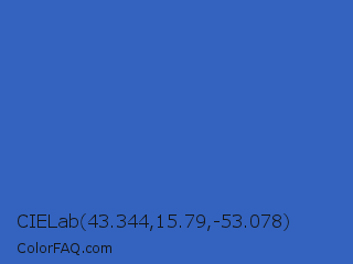 CIELab 43.344,15.79,-53.078 Color is a normal blue color and the nearest color is Mariner #286acd. Hex code #3363bf and RGB value is rgb(51,99,191). In RGB color space, this color is composed of 20% red, 39% green, 75% blue, In CMYK color space, this color is composed of 73% cyan, 48% magenta, 0% yellow , 25% black , In HSL color space, this color has a hue angle of 219° , 58% saturation and 47% lightness.