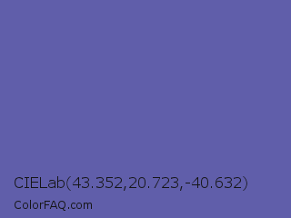 CIELab 43.352,20.723,-40.632 Color is a normal indigo color and the nearest color is Scampi #675fa6. Hex code #605eaa and RGB value is rgb(96,94,170). In RGB color space, this color is composed of 38% red, 37% green, 67% blue, In CMYK color space, this color is composed of 44% cyan, 45% magenta, 0% yellow , 33% black , In HSL color space, this color has a hue angle of 242° , 31% saturation and 52% lightness.